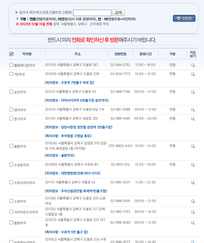 검색이 완료되면 휴일에 여는 약국의 목록이 이렇게 뜹니다.