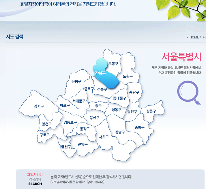 가운데에 보이는 휴일지킴이 검색, 연중무휴검색, 심야약국 검색 중에 휴일지킴이 검색을 눌러줍니다.